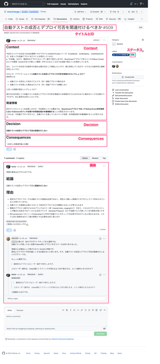 またADRの記録場所として2021/08に正式版となったGitHub Discussionsを使ってみましたのでこれについても少し触れてみます。